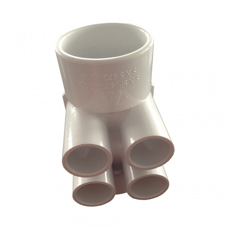 Tento vodný rozdeľovač je vyrobený z PVC materiálu, ktorý je odolný voči chemikáliám, má minimálnu hmotnosť a vysokú pevnosť. Je vhodný napríklad na použitie do víriviek, bazénov či zavlažovania. Hladká vnútorná úprava zabezpečuje zníženie trenia a predchádza zachytávaniu rôznych čiastočiek a materiálov.Inštalácia lepením, vnútorné aj vonkajšie nasádzanie. Rozmery:vstup vnútorný priemer Ø 60 mmvýstup vonkajší priemer Ø 60 mm4x port vnútorný priemer Ø 26 mmMateriál: PVCFarba: biela