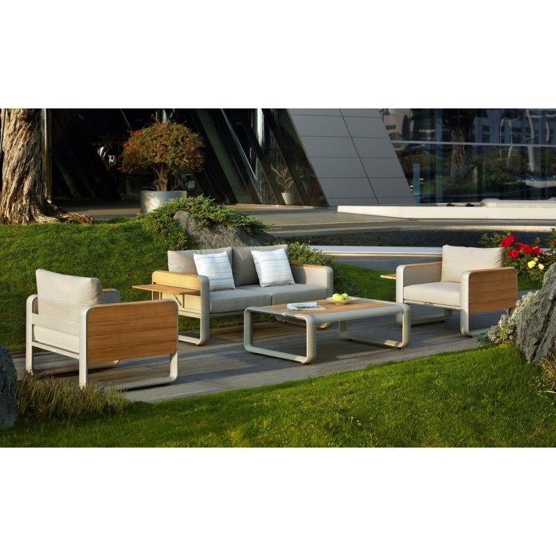Kreslo s robustným kovovým rámom vyžaruje silu a odolnosť, no jeho jemne zaoblené hrany a drevené detaily s textúrou prírodnej kresby ho zjemňujú. Čalúnenie v neutrálnych tónoch dodáva sedeniu pohodlie bez toho, aby sa obetoval štýl, a robí z kolekcie pokojný a vkusný doplnok každého exteriéru.