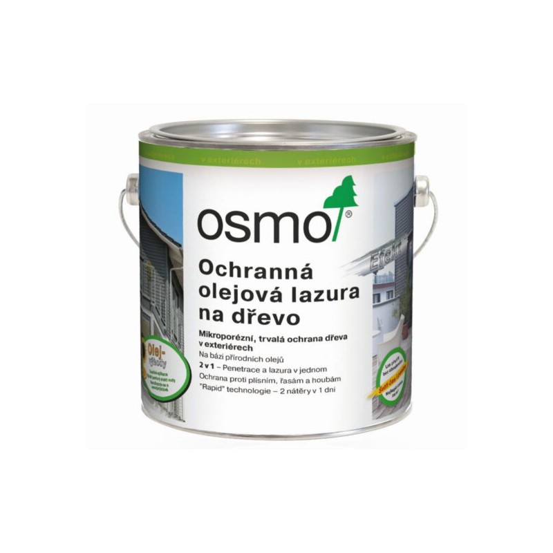 OSMO - OCHRANNÁ OLEJOVÁ LAZÚRA EFEKT je dekoratívny, transparentný polomatný náter na drevo s metalickým efektom, vhodný pre exteriér. Predstavuje dlhodobú ochranu na báze oleja (penetrácia + lazúra). Náter nepraská a neodlupuje sa. Je vodoodolný a extrémne odolný voči poveternostným podmienkam, UV stabilný. Oživenie náteru sa prevedie jednoduchým pretrením (žiadne základovanie a prebrusovanie – žiadny jemný prach). Povrchová úprava obsahuje účinné zložky na preventívnu ochranu proti plesniam, riasam a hubám a po desaťročia sa osvedčil v extrémnych klimatických podmienkach.