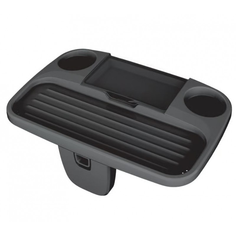 Bezpečnostý a všestranný podnosový stolík s dvoma držiakmi na poháre, protišmykovou (ryhovanou) plochou a špeciálnou vodotesnou časťou na uloženie predmetov, ako sú mobilné telefóny.