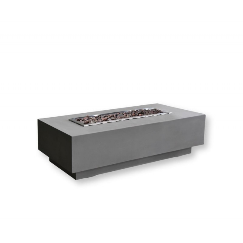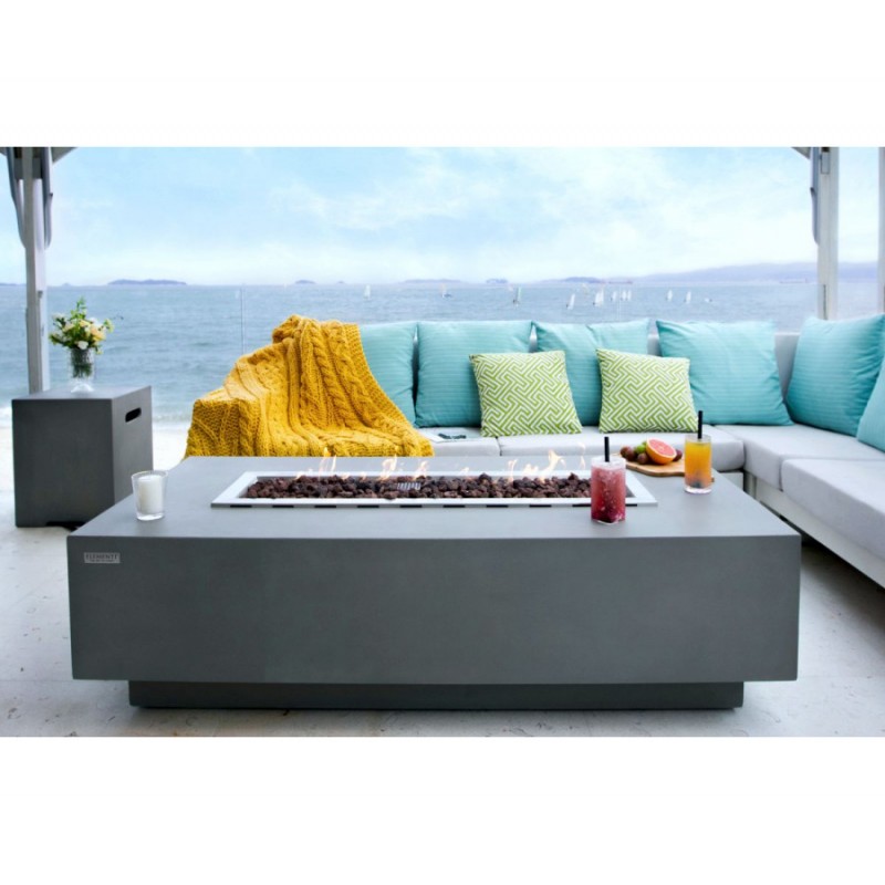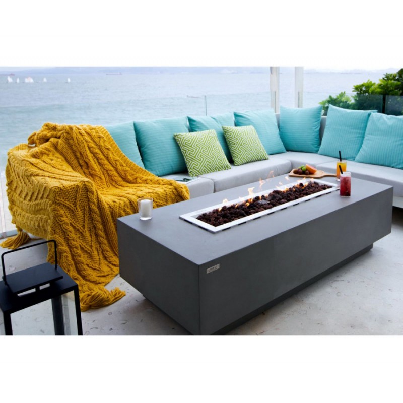 Elegantný terasový stôl osadený dlhým ohniskom s výkonom reálneho krbu a veľkorysou stolovou plochou okolo ohňa.