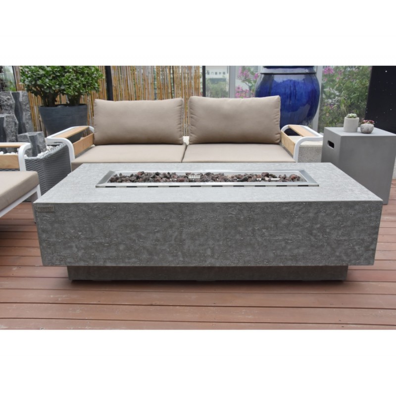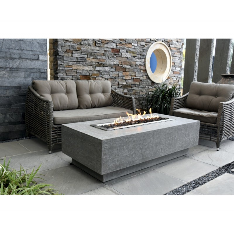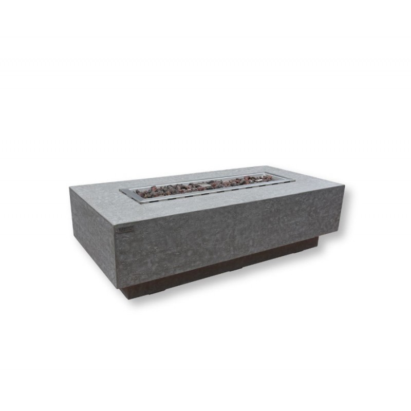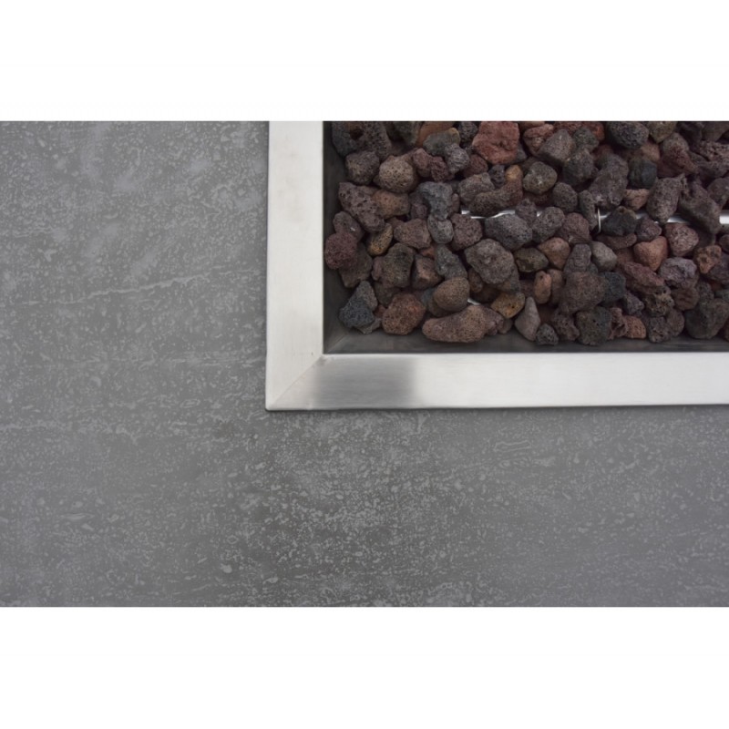 Elegantný terasový stôl osadený dlhým ohniskom s výkonom reálneho krbu a veľkorysou stolovou plochou okolo ohňa.