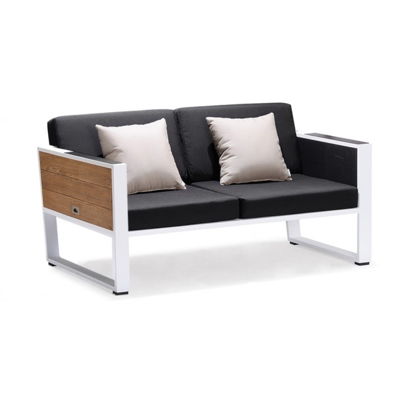 Súprava YORK predstavuje kombinácia textilu, teakového dreva a bieleho hliníka.Jej výnimočný dizajn je inšpirovaný interiérovým nábytkom.Výrazný farebný kontrast pod slnečnými lúčmi vytvára teplý pocit domova. Rozmery: 815x1510x610 mm Materiál: Hliník/Teakove drevo, podsedáky a vankúše sú súčasťou balenia Farba: čierna/biela